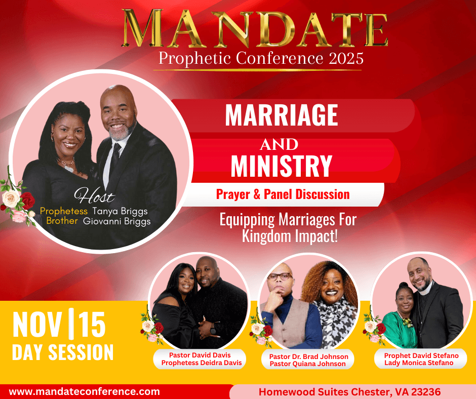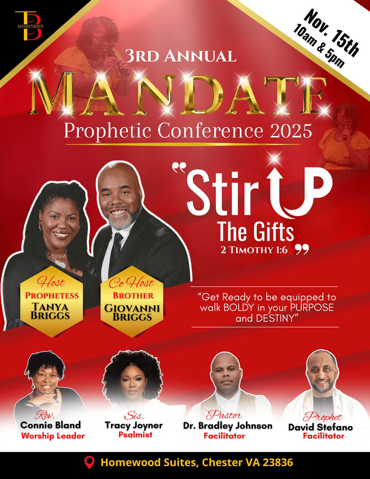 The Mandate Prophetic Conference 2025 is a dynamic one-day gathering designed to stir up spiritual gifts and equip prophetic voices for greater Kingdom impact. Hosted by Tanya Briggs Ministries, this conference unites believers for a transformative experience filled with powerful teaching, prophetic activation, worship encounters, and opportunities for healing and deliverance.